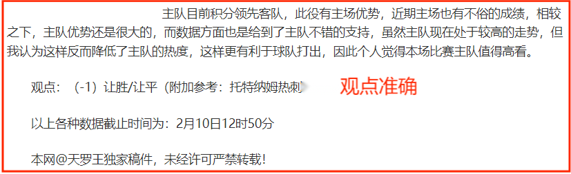 (温馨提示:观点回顾为已完场赛事的统计,并不能代表未来的观点预测结果走势,观点仅为其个人意见,与平.台无关。资讯仅供体育爱好者浏览,并不构成购.彩建议,任何人不得用于非法用途,请广大用户理性消费。)