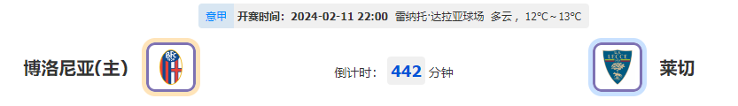 北京时间02月11日22:00,意甲第24轮,博洛尼亚vs莱切。博洛尼亚仍居上游位置,如今状态还是起伏不定,他们能否在此役重新取胜?莱切落后不少止颓心切,当下刚好结束多连不胜的颓势,此役作战谁是更有作为的一方?