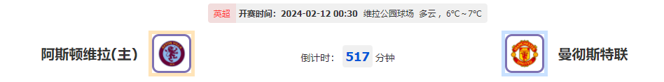 北京时间2月12日的凌晨00点30分,英超联赛的第24轮赛事即将迎来一场焦点对决!——本赛季颇具“黑马”风采的阿斯顿维拉将会坐镇维拉公园球场迎战传统豪门“红魔”曼彻斯特联!在近期豪取各项赛事三连胜的红魔能否延续火力全开的态势作客全身而退?还是近期状态有所起伏的阿斯顿维拉能够借助主场之势重返胜轨?下面将由Yoyo姐将为大家带来详细的赛事分析: