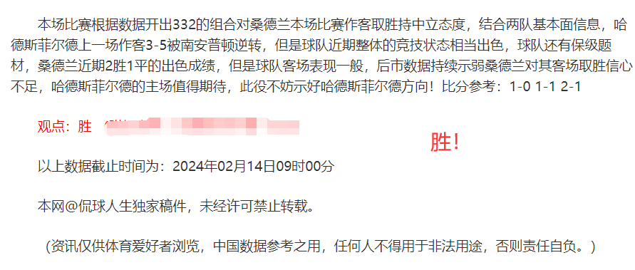 (温馨提示:观点回顾为已完场赛事的统计,并不能代表未来的观点预测结果走势,观点仅为其个人意见,与平.台无关。资讯仅供体育爱好者浏览,并不构成购.彩建议,任何人不得用于非法用途,请广大用户理性消费。)
