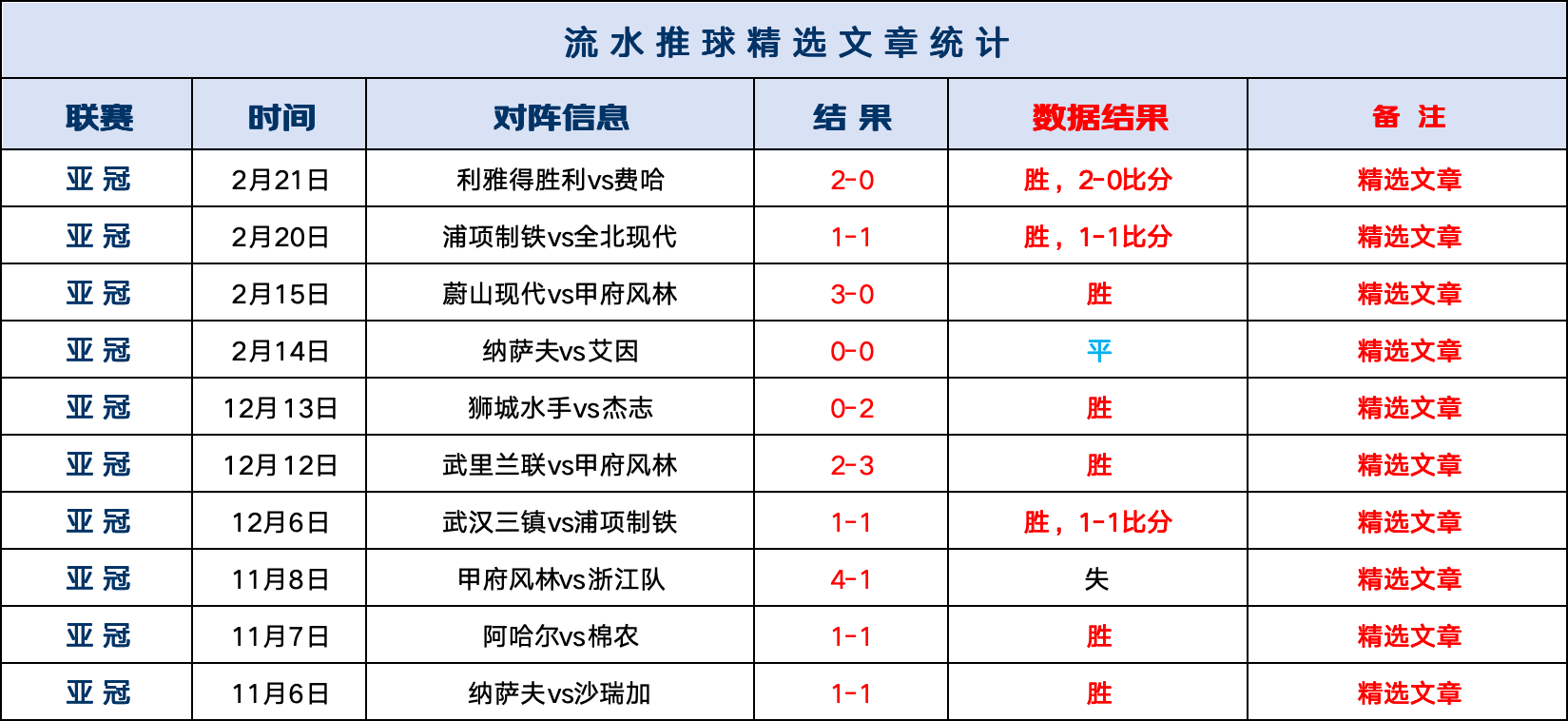 赞赏回顾:流水昨天赞赏1胜1失,连续两天拿到欧冠1-1比分,昨天获得两个比分,那不勒斯1-1巴塞罗那+精选:利雅得胜利2-0费哈,方向跑出。流水赞赏曾连续6周周榜第一,更是有156天总体正确率近7成(不含走)的长期稳定发挥,今天继续一起采摘果实!!!