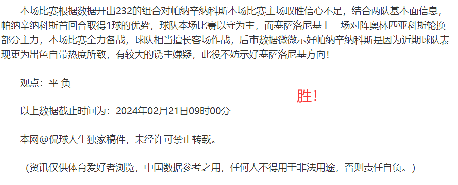 (温馨提示:观点回顾为已完场赛事的统计,并不能代表未来的观点预测结果走势,观点仅为其个人意见,与平.台无关。资讯仅供体育爱好者浏览,并不构成购.彩建议,任何人不得用于非法用途,请广大用户理性消费。)