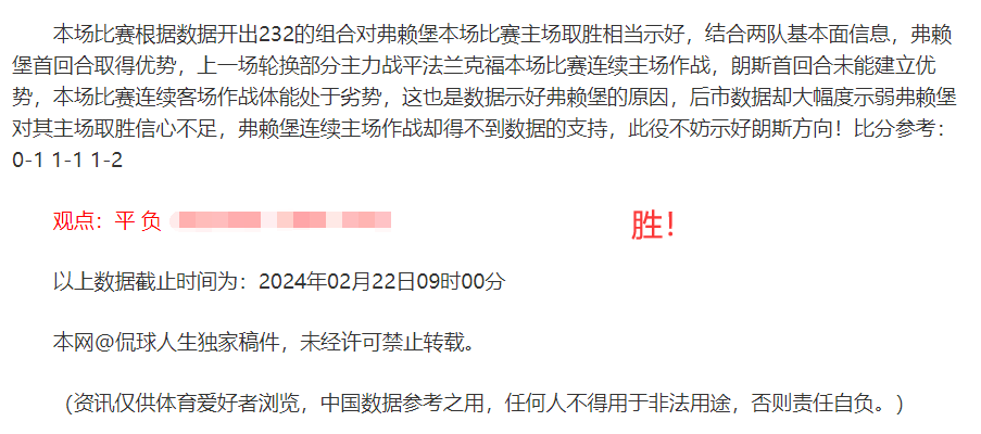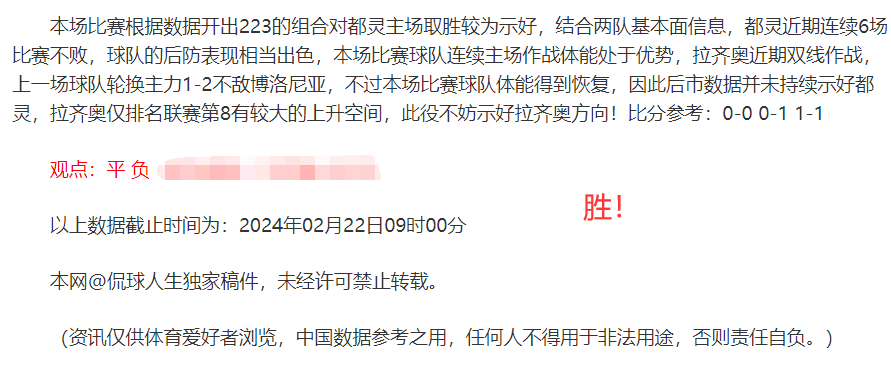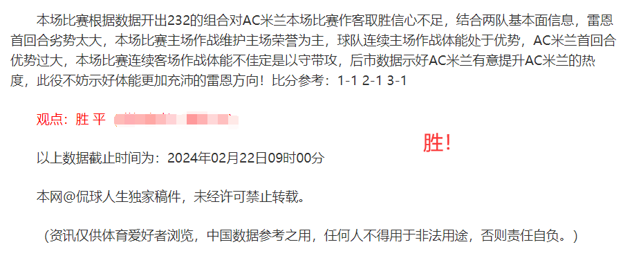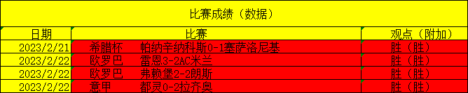 (温馨提示:观点回顾为已完场赛事的统计,并不能代表未来的观点预测结果走势,观点仅为其个人意见,与平.台无关。资讯仅供体育爱好者浏览,并不构成购.彩建议,任何人不得用于非法用途,请广大用户理性消费。)