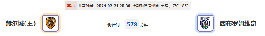 北京时间02月24日20:30,英冠第34轮,赫尔城对阵西布罗姆维奇。赫尔城一举拿下三连胜,此番坐镇主场能否继续出击,他们能否延续状态更胜一筹?西布罗姆维奇表现平分秋色,如今挑战不失底气,球队此役能否如愿全身而退?