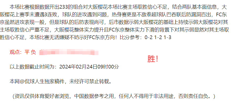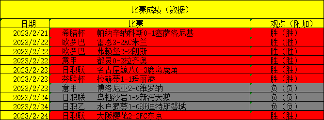 (温馨提示:观点回顾为已完场赛事的统计,并不能代表未来的观点预测结果走势,观点仅为其个人意见,与平.台无关。资讯仅供体育爱好者浏览,并不构成购.彩建议,任何人不得用于非法用途,请广大用户理性消费。)