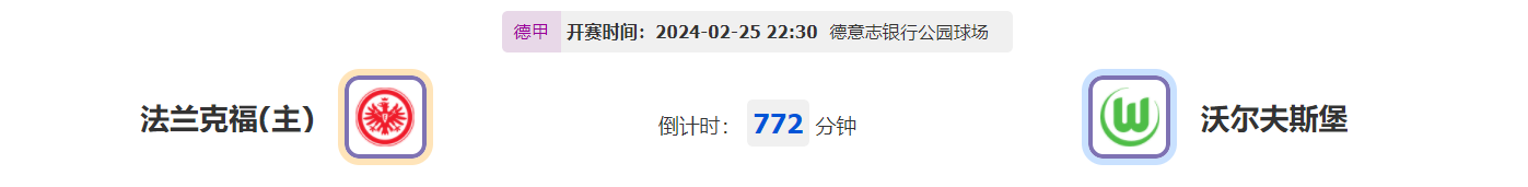 看点:法兰克福近期各项赛事连续5场比赛不胜,此役主场作战能否及时调整?沃尔夫斯堡上一场战平多特蒙德表现有所好转,此役作客能否延续上一场出色表现?