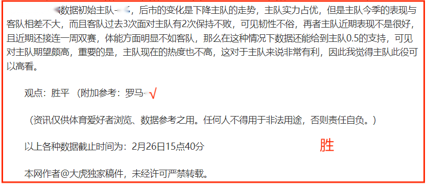 (温馨提示:观点回顾为已完场赛事的统计,并不能代表未来的观点预测结果走势,观点仅为其个人意见,与平.台无关。资讯仅供体育爱好者浏览,并不构成购.彩建议,任何人不得用于非法用途,请广大用户理性消费。)