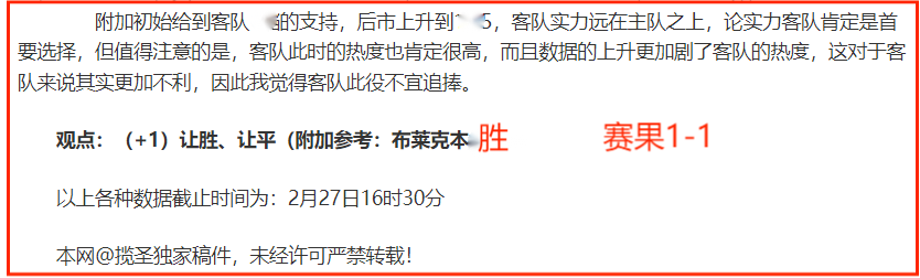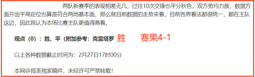 (温馨提示:观点回顾为已完场赛事的统计,并不能代表未来的观点预测结果走势,观点仅为其个人意见,与平.台无关。资讯仅供体育爱好者浏览,并不构成购.彩建议,任何人不得用于非法用途,请广大用户理性消费。)