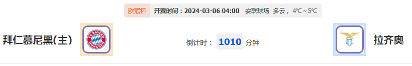 北京时间2024年3月6日04:00,2023-2024 欧洲联赛冠军杯赛,拜仁慕尼黑vs拉齐奥,此役是欧冠杯十六强第二回合的较量。拉齐奥十六强首回合主场1球小胜拜仁慕尼黑,占得晋级主动权,此役客场再度迎战拜仁慕尼黑,两队将如何对峙?下面由本作者为大家做详细阐述。
