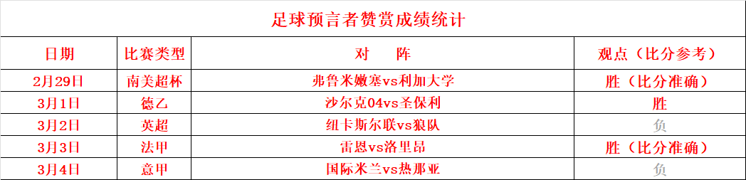 (温馨提示:观点回顾为已完场赛事的统计,并不能代表未来的观点预测结果走势,观点仅为其个人意见,与平.台无关。资讯仅供体育爱好者浏览,并不构成购.彩建议,任何人不得用于非法用途,请广大用户理性消费。)