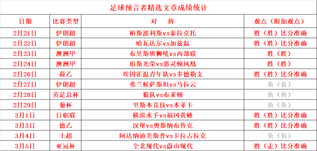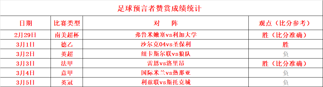 (温馨提示:观点回顾为已完场赛事的统计,并不能代表未来的观点预测结果走势,观点仅为其个人意见,与平.台无关。资讯仅供体育爱好者浏览,并不构成购.彩建议,任何人不得用于非法用途,请广大用户理性消费。)
