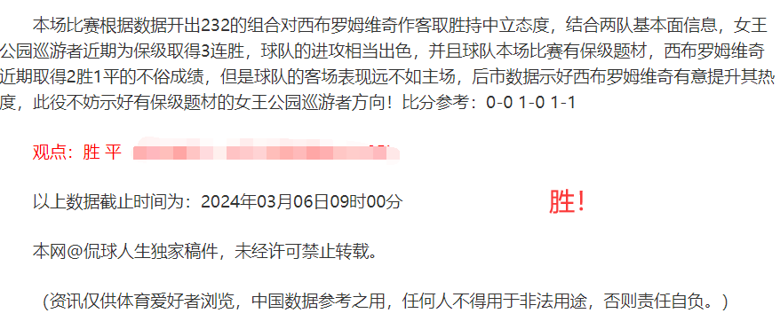 (温馨提示:观点回顾为已完场赛事的统计,并不能代表未来的观点预测结果走势,观点仅为其个人意见,与平.台无关。资讯仅供体育爱好者浏览,并不构成购.彩建议,任何人不得用于非法用途,请广大用户理性消费。)