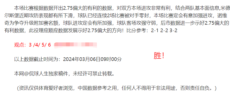 (温馨提示:观点回顾为已完场赛事的统计,并不能代表未来的观点预测结果走势,观点仅为其个人意见,与平.台无关。资讯仅供体育爱好者浏览,并不构成购.彩建议,任何人不得用于非法用途,请广大用户理性消费。)