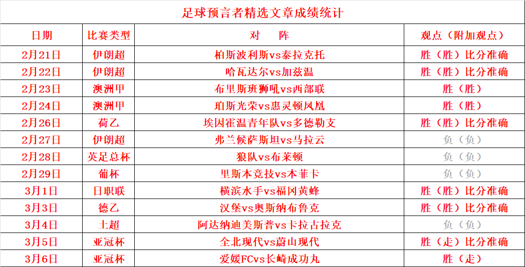 (温馨提示:观点回顾为已完场赛事的统计,并不能代表未来的观点预测结果走势,观点仅为其个人意见,与平.台无关。资讯仅供体育爱好者浏览,并不构成购.彩建议,任何人不得用于非法用途,请广大用户理性消费。)