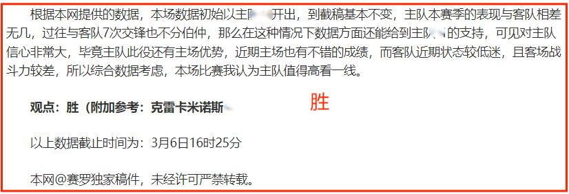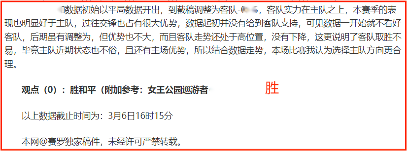 (温馨提示:观点回顾为已完场赛事的统计,并不能代表未来的观点预测结果走势,观点仅为其个人意见,与平.台无关。资讯仅供体育爱好者浏览,并不构成购.彩建议,任何人不得用于非法用途,请广大用户理性消费。)