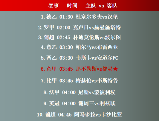 赛事前瞻:本文提供03月09日01时30分-04时45分时段的10场足球赛事走势分析表,当中包括德乙、西乙、意甲、比甲等赛事提供分析参考,具备较高的参考价值。主要关注赛程如下: