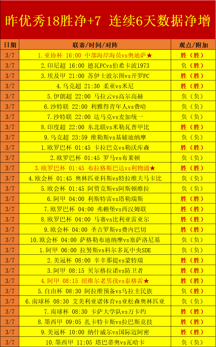 昨天完成赛程继续拿下18场优秀的胜利观点分享,单日进度取得净+7数据增长!交出的每一个精选板块均展现出了精彩的数据击中能力,3月上旬赛程计划连续6日时间取得增长的数据增长,与笔者过去取得的15个连胜旬计划成功完成接驳,在过去的5个月时间里,笔者交出了15个稳定且优秀的连续旬计划数据增长,合计为大家带来的净+410的正向成绩,目前上旬进度调整完成重新回到了净+14的优质增长通道!继续保持对数据模块的信任,精选值得关注的焦点赛程进行组合冲刺,争取在3月上旬计划里想着更高峰值进行冲击!