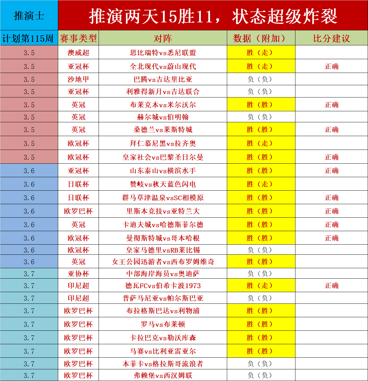 1、两天拿下15胜10的佳绩,状态保持炸裂,昨天欧罗巴杯拿下6胜4,近期欧冠和欧罗巴的成绩突出,期待下一次欧战。