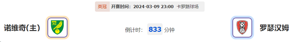北京时间03月09日23:00,英冠第37轮赛事诺维奇vs罗瑟汉姆,诺维奇当下的状态仍然不稳,他们能否在此役捍卫主场继续出击?罗瑟汉姆境况更为惨淡,如今不败底气也是全无,此番挑战是否已做好准备?