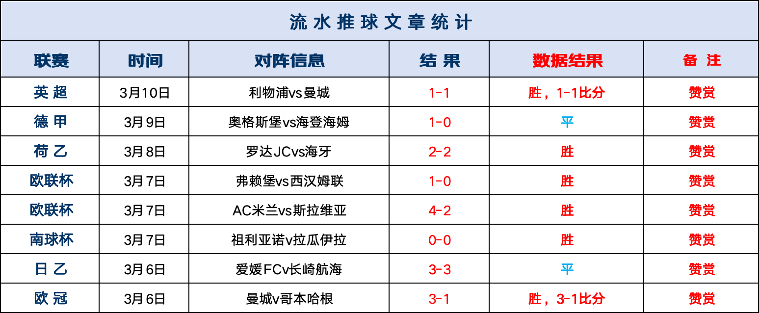 【日韩教主】独家日韩比赛一手资讯,完善的比赛模型库,解读精准独到!赞赏回顾:流水赞赏高歌猛进,昨天拿下英超红蓝会1-1比分,利物浦1-1曼城,方向顺利跑出。流水赞赏曾连续6周周榜第一,更是有156天总体正确率近7成(不含走)的长期稳定发挥,今天继续一起采摘果实!!!