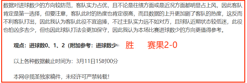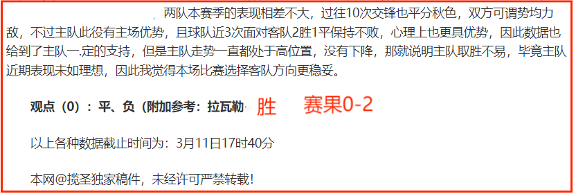 (温馨提示:观点回顾为已完场赛事的统计,并不能代表未来的观点预测结果走势,观点仅为其个人意见,与平.台无关。资讯仅供体育爱好者浏览,并不构成购.彩建议,任何人不得用于非法用途,请广大用户理性消费。)