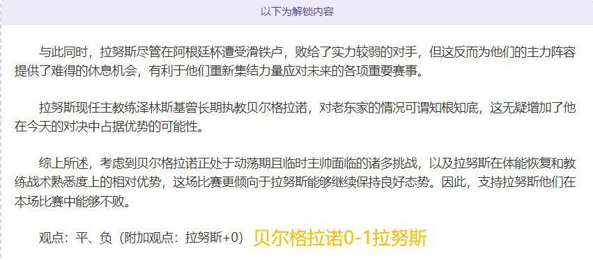 昨天的公推赛事推延一天,精选赛事:阿甲-贝尔格拉诺0-1拉努斯,支持客队方向没有问题。
