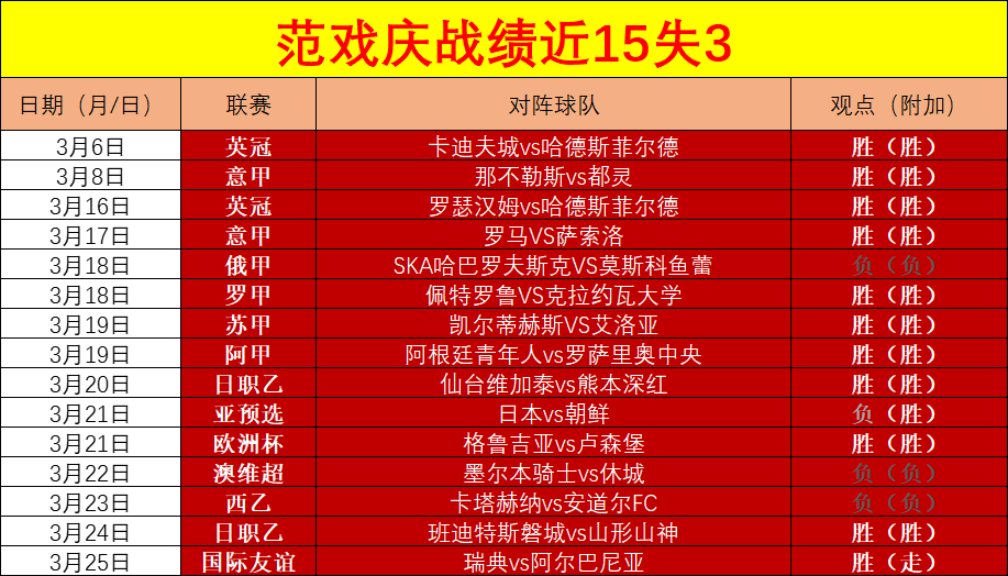 大家好,我是范戏庆,体育学校毕业,学生时代曾任校队队长也助教一职,目前从事足球行业,对足球领域有丰富的经验,擅长的联赛有英超、意甲、德甲、日系、澳甲等,对于冷门数据有敏锐的洞察力。