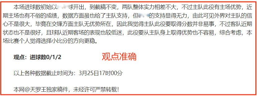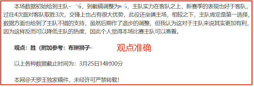 (温馨提示:观点回顾为已完场赛事的统计,并不能代表未来的观点预测结果走势,观点仅为其个人意见,与平.台无关。资讯仅供体育爱好者浏览,并不构成购.彩建议,任何人不得用于非法用途,请广大用户理性消费。)