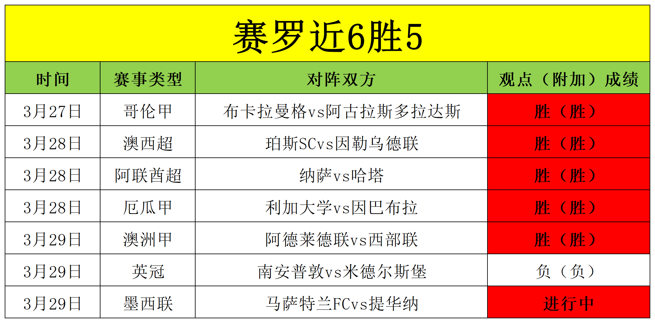 昨天澳洲甲继续打出,剩余一场墨西联仍在进行,近期取得6胜5的佳绩,笔者状态正盛,今天信心继续。