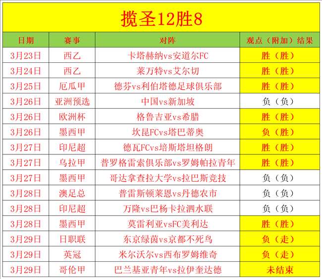 揽圣2023年10月4日至10月9日豪取18连胜。昨天的日职联和英冠双双打平,剩余一场哥伦甲还没结束,笔者目前是12胜8的佳绩,保持稳定,今天我们再接再厉。足球比赛是追求长期的稳定,长期的关注才能得益,一时的下滑并不意味着失败,大家不要因为一时的下滑而放弃关注,笔者会努力挖掘更精准的赛事分享给大家,感谢大家的支持。