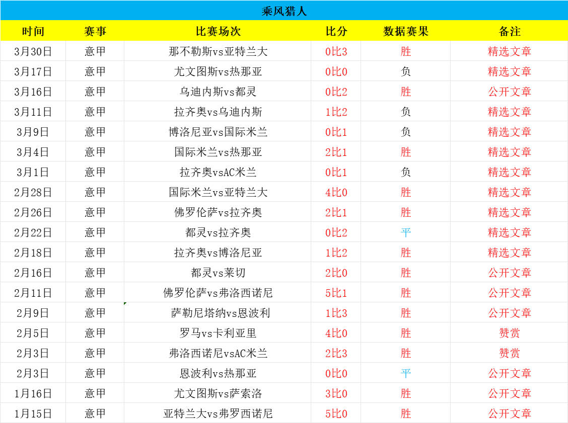 大家好,我是乘风猎人,职业数据分析师,足球经验丰富,研究足球数据数十载,期望能够乘风破浪,精准猎球制胜,欢迎朋友们长期关注!