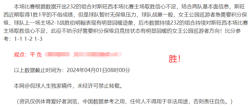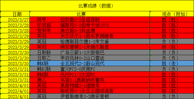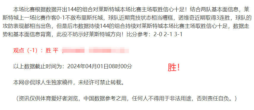 (温馨提示:观点回顾为已完场赛事的统计,并不能代表未来的观点预测结果走势,观点仅为其个人意见,与平.台无关。资讯仅供体育爱好者浏览,并不构成购.彩建议,任何人不得用于非法用途,请广大用户理性消费。)