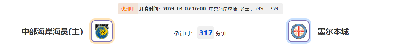 看点:中部海岸海员上一场比赛作客0-2不敌悉尼FC,此役主场作战能否及时调整?墨尔本城上一场主场0-0战平纽卡斯尔喷气机,此役作客状态能否提升?