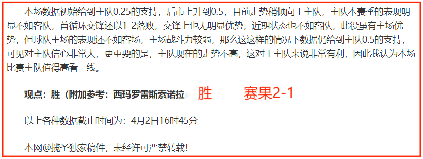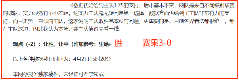 (温馨提示:观点回顾为已完场赛事的统计,并不能代表未来的观点预测结果走势,观点仅为其个人意见,与平.台无关。资讯仅供体育爱好者浏览,并不构成购.彩建议,任何人不得用于非法用途,请广大用户理性消费。)