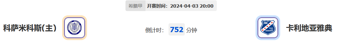 北京时间2024年4月4日20:00,希腊甲啊2023-2024赛季升级组第3轮比赛,科萨米科斯vs卡利地亚雅典,科萨米科斯赛季两次对阵到卡利地亚雅典的比赛均取得积分,本次回到主场能否轻松捍卫尊严?作客的卡利地亚雅典进入争冠组以来保持不败得分,此前更是有过作客大败对手的精彩表现,本轮能否顺利从科萨米科斯手上抢走积分?让我们一起拭目以待!