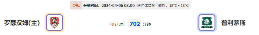 北京时间04月06日03:00,英冠第41轮赛事罗瑟汉姆vs普利茅斯,罗瑟汉姆当下的状态仍然不稳,他们能否在此役捍卫主场继续出击?罗瑟汉姆境况更为惨淡,如今不败底气也是全无,此番挑战是否已做好准备?