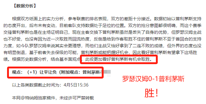(温馨提示:观点回顾为已完场赛事的统计,并不能代表未来的观点预测结果走势,观点仅为其个人意见,与平.台无关。资讯仅供体育爱好者浏览,并不构成购.彩建议,任何人不得用于非法用途,请广大用户理性消费。)
