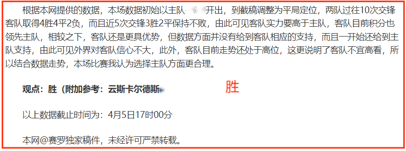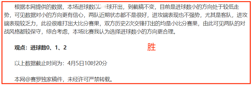 (温馨提示:观点回顾为已完场赛事的统计,并不能代表未来的观点预测结果走势,观点仅为其个人意见,与平.台无关。资讯仅供体育爱好者浏览,并不构成购.彩建议,任何人不得用于非法用途,请广大用户理性消费。)