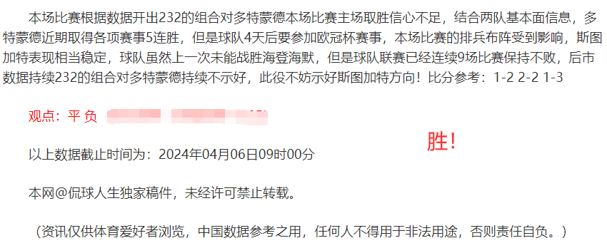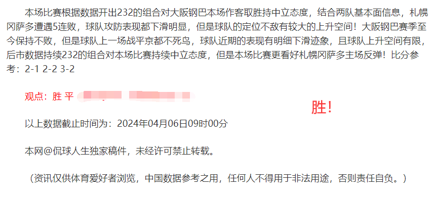 (温馨提示:观点回顾为已完场赛事的统计,并不能代表未来的观点预测结果走势,观点仅为其个人意见,与平.台无关。资讯仅供体育爱好者浏览,并不构成购.彩建议,任何人不得用于非法用途,请广大用户理性消费。)