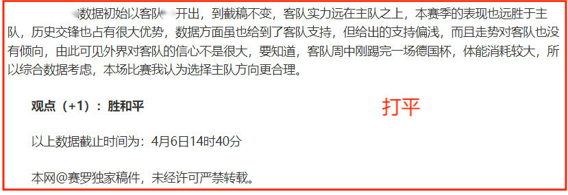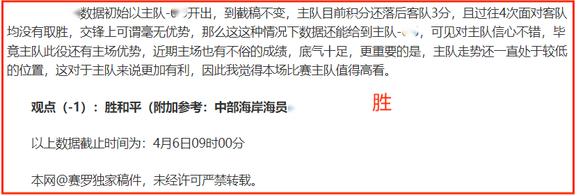 (温馨提示:观点回顾为已完场赛事的统计,并不能代表未来的观点预测结果走势,观点仅为其个人意见,与平.台无关。资讯仅供体育爱好者浏览,并不构成购.彩建议,任何人不得用于非法用途,请广大用户理性消费。)