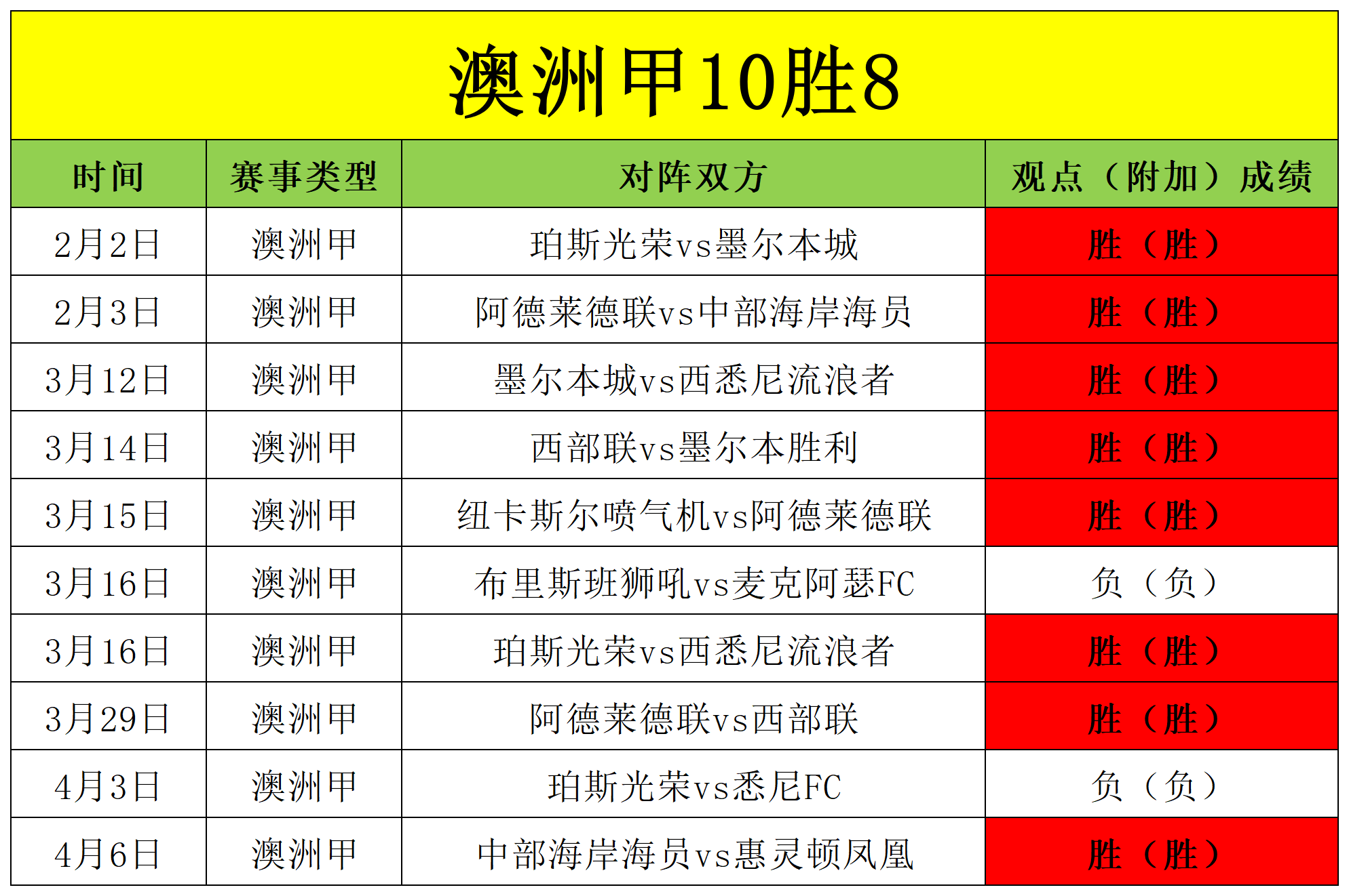 昨天4场比赛有一场还在进行,其余3场1胜1平1负,目前是6胜4的佳绩(走的不算),笔者状态依旧,今天继续追击。前面笔者分享了一场日职联的比赛,接下来重点分享一场澳洲甲的比赛,澳洲甲近期取得了10胜8的佳绩。