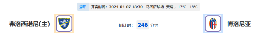 北京时间04月07日18:30,2023-2024 意大利甲组联赛,两队近期表现差距非常之大,今天比赛坐镇主场弗洛西诺尼还能抵挡博洛尼亚吗?