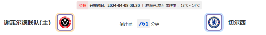 北京时间04月08日00:30,英超第32轮,谢菲尔德联队对阵切尔西。谢菲尔德联队近期成绩惨淡无法得到回升,此番回到主场能否触底反弹,他们能否抗衡对手?切尔西本状态逐渐会否强势,当下也是看到欧战的希望,球队此役能否压制对手?