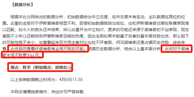 (温馨提示:观点回顾为已完场赛事的统计,并不能代表未来的观点预测结果走势,观点仅为其个人意见,与平.台无关。资讯仅供体育爱好者浏览,并不构成购.彩建议,任何人不得用于非法用途,请广大用户理性消费。)