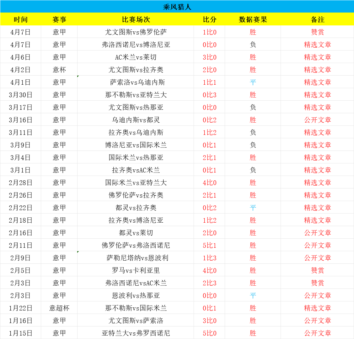 昨意甲尤文胜比分,意大利赛事25场5负!昨赞赏意甲尤文进球数完美拿下,再胜比分,英超失!长期超燃赞赏81场24负+长线近各项220场74负,依然是极强的状态,今日全力研究,争取拿下全胜,欢迎赞赏,再创佳绩!——今日重点参考乘胜追击!老铁们一起冲!