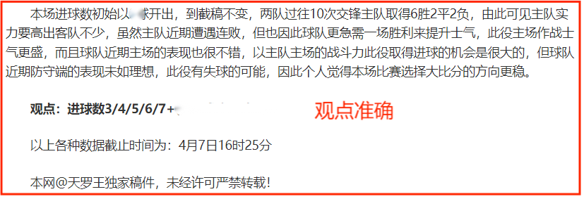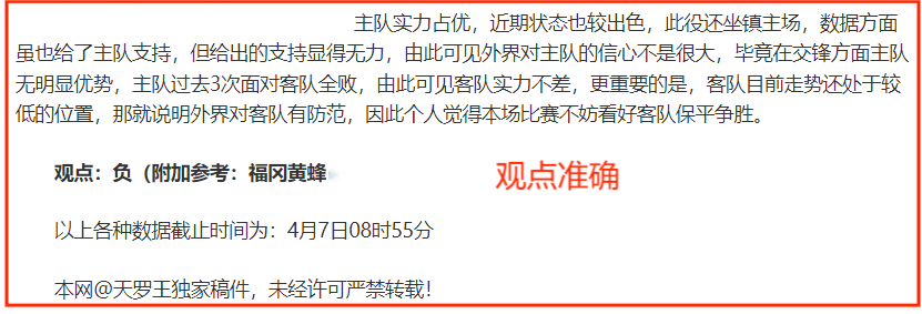 (温馨提示:观点回顾为已完场赛事的统计,并不能代表未来的观点预测结果走势,观点仅为其个人意见,与平.台无关。资讯仅供体育爱好者浏览,并不构成购.彩建议,任何人不得用于非法用途,请广大用户理性消费。)