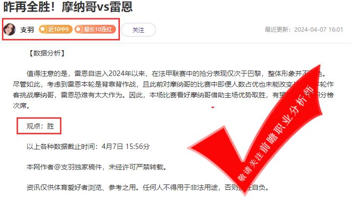 战绩回顾:昨日公推顺利取得胜利,近期更是直取近10中9醒目标识,TA的另外一个身份是私推大咖,每晚22点精准临场数据参考、独家观点准时送上,打赏作者文章才能获得哦~