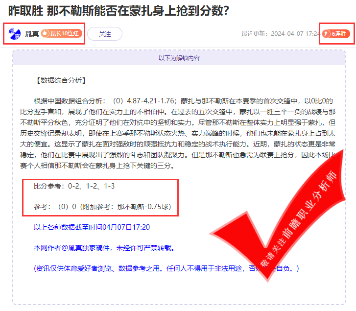 战绩回顾:随着昨晚那不勒斯客场4-2大胜对手,作者顺利拿下6连胜标识,作者胤真数据分析高度精准把握赛事走向并识破有关数据的剧本伎俩,赶紧关注!不要擦肩而过!