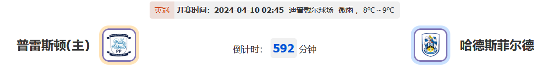 北京时间2024年04月10日02时45分,英冠联赛2023-2024赛季第42轮比赛,普雷斯顿vs哈德斯菲尔德,主队目前在英冠联赛积分榜中游位置无欲无求,本次的主场对赛能否对求分若渴争取保级的哈德斯菲尔德造成抢分阻力?让我们一起期待!