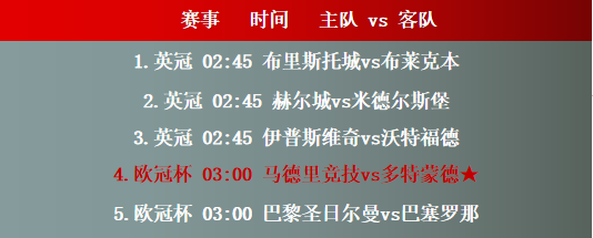 4. 马德里竞技vs多特蒙德,马德里竞技西甲赛季15轮主场比赛取得13胜1平得分表现,攻守端数据发挥堪称完美,得失比达到2:1的优秀档次,本轮欧冠主场迎战对手是德甲劲旅多特蒙德,后者德甲赛季14轮作客比赛取得7胜6平得分表现,攻守端数据发挥相当优秀,但对赛表现波动较大出现过多平局,暂时仍未能回到德甲联赛的前列的欧冠名次。